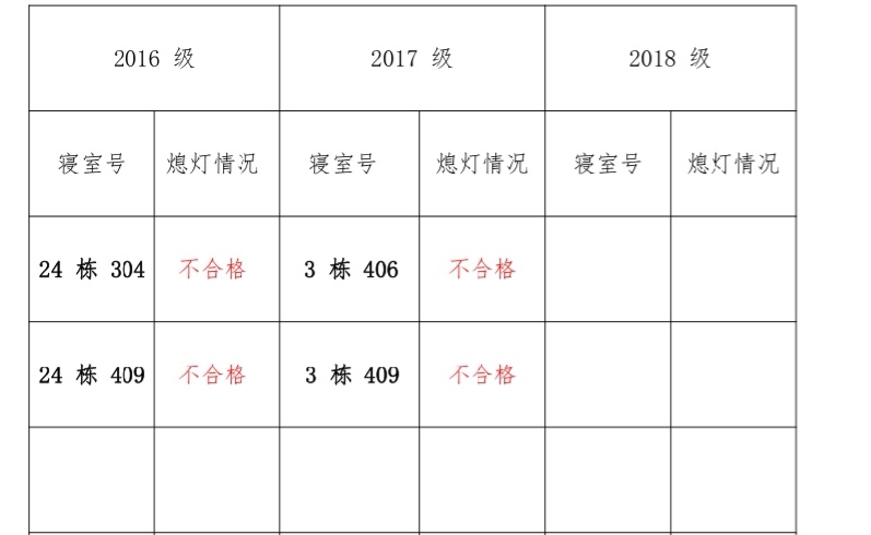 为改正各种不良现象和陋习,增强宿舍学习氛围,营造温馨家园氛围,化学化工学院学生会生活部对三个年级所有寝室进行熄灯检查。本次熄灯情况通 报不合格寝室 4 间,具体情况如下: