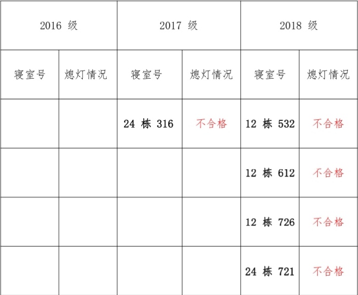 为改正各种不良现象和陋习,增强宿舍学习氛围,营造温馨家园氛围,化学化工学院学生会生活部对三个年级所有寝室进行熄灯检查。 本次熄灯情况通报不合格寝室 5 间,具体情况如下: