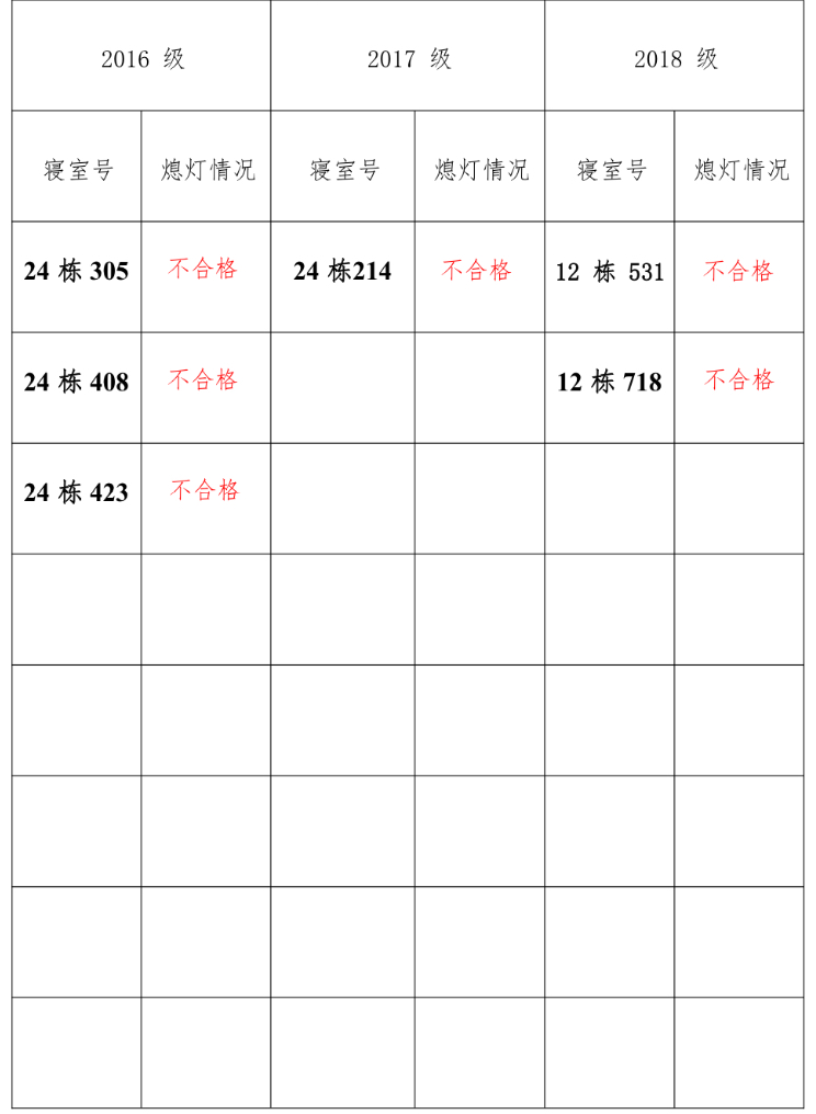 为改正各种不良现象和陋习,增强宿舍学习氛围,营造温馨家园氛围,化学化工学院学生会生活部对三个年级所有寝室进行熄灯检查。本次熄灯情况通报不合格寝室 6 间,具体情况如下: 为改正各种不良现象和陋习,增强宿舍学习氛围,营造温馨家园氛围,化学化工学院学生会生活部对三个年级所有寝室进行熄灯检查。本次熄灯情况通报不合格寝室 6 间,具体情况如下: