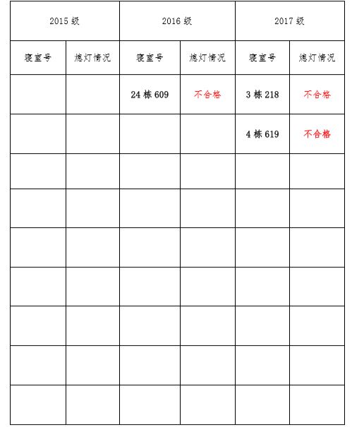为改正各种不良现象和陋习,增强宿舍学习氛围,营造温馨家园氛围,化学化工学院学生会生活部对三个年级所有寝室进行熄灯检查。 本次熄灯情况通报不合格寝室 3 间,具体情况如下: