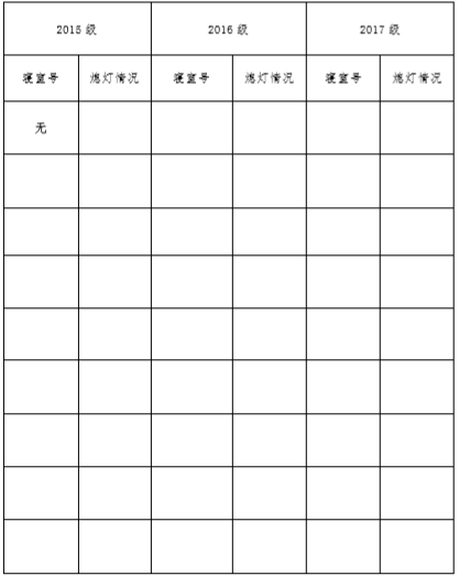 为改正各种不良现象和陋习,增强宿舍学习氛围,营造温馨家园氛围,化学化工学院学生会生活部对三个年级所有寝室进行熄灯检查。 本次熄灯情况通报不合格寝室 0 间,具体情况如下: