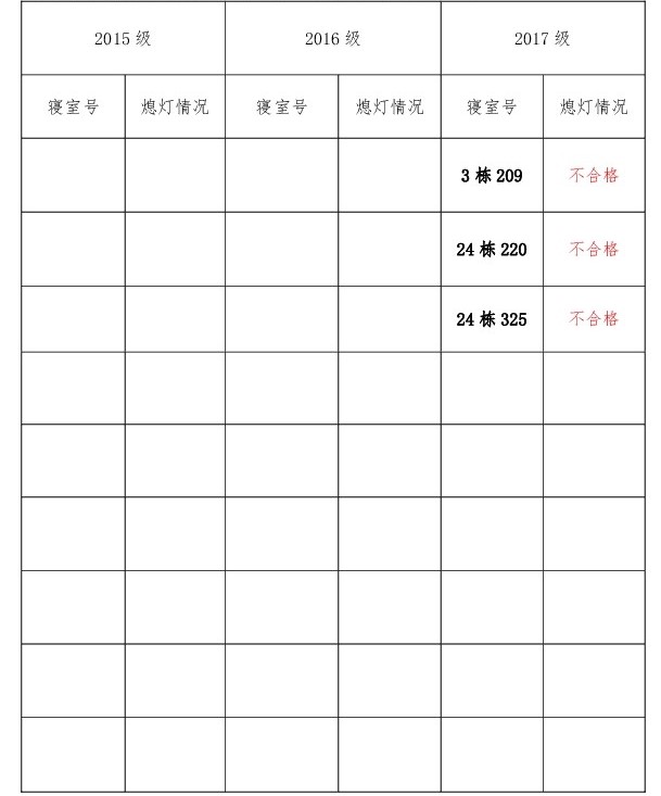 为改正各种不良现象和陋习,增强宿舍学习氛围,营造温馨家园氛围,化学化工学院团委学生会生活权益服务部对三个年级所有寝室进行熄灯检查。本次熄灯情况通报不合格寝室3间,具体情况如下: