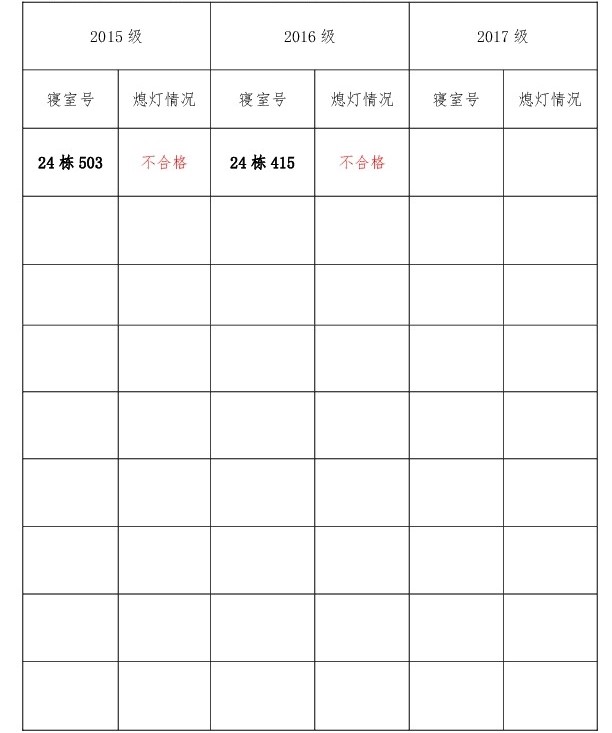 为改正各种不良现象和陋习,增强宿舍学习氛围,营造温馨家园氛围,化学化工学院团委学生会生活权益服务部对三个年级所有寝室进行熄灯检查。本次熄灯情况通报不合格寝室2间,具体情况如下: