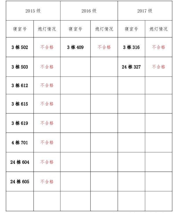 为改正各种不良现象和陋习,增强宿舍学习氛围,营造温馨家园氛围,化学化工学院团委学生会生活权益服务部对三个年级所有寝室进行熄灯检查。本次熄灯情况通报不合格寝室11间,具体情况如下:
