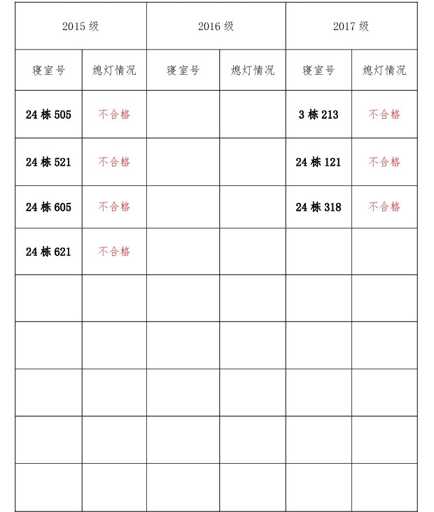 为改正各种不良现象和陋习,增强宿舍学习氛围,营造温馨家园氛围,化学化工学院团委学生会生活权益服务部对三个年级所有寝室进行熄灯检查。本次熄灯情况通报不合格寝室7间,具体情况如下: