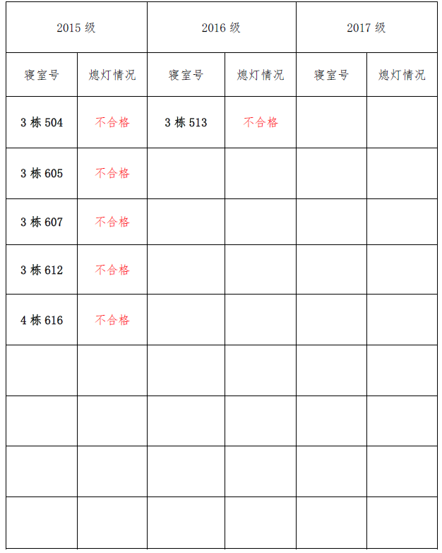 为改正各种不良现象和陋习,增强宿舍学习氛围,营造温馨家园氛围,化学化工学院团委学生会生活权益服务部对三个年级所有寝室进行熄灯检查。本次熄灯情况通报不合格寝室6间,具体情况如下: