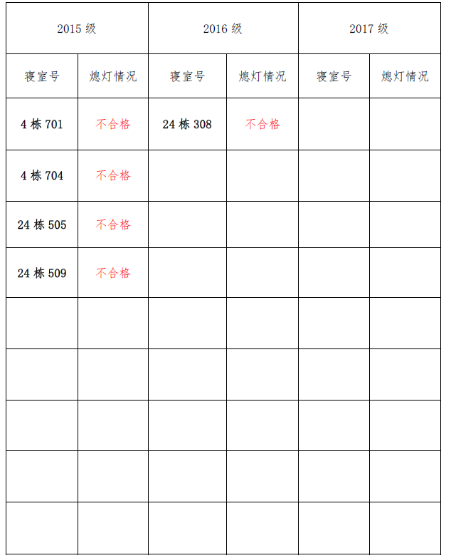 为改正各种不良现象和陋习,增强宿舍学习氛围,营造温馨家园氛围,化学化工学院团委学生会生活权益服务部对三个年级所有寝室进行熄灯检查。本次熄灯情况通报不合格寝室5间,具体情况如下:
