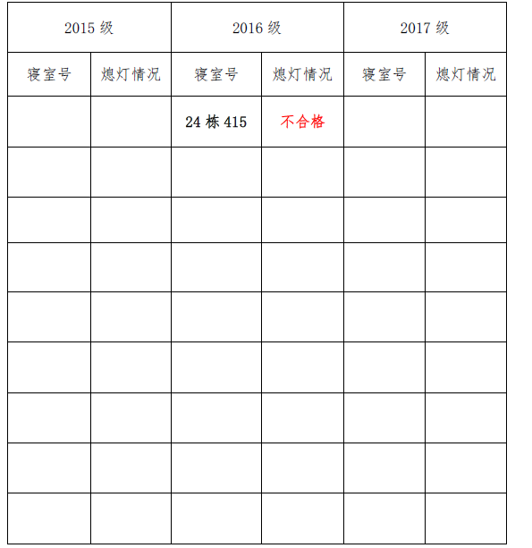 为改正各种不良现象和陋习,增强宿舍学习氛围,营造温馨家园氛围,化学化工学院团委学生会生活权益服务部对三个年级所有寝室进行熄灯检查。本次熄灯情况通报不合格寝室1间,具体情况如下: