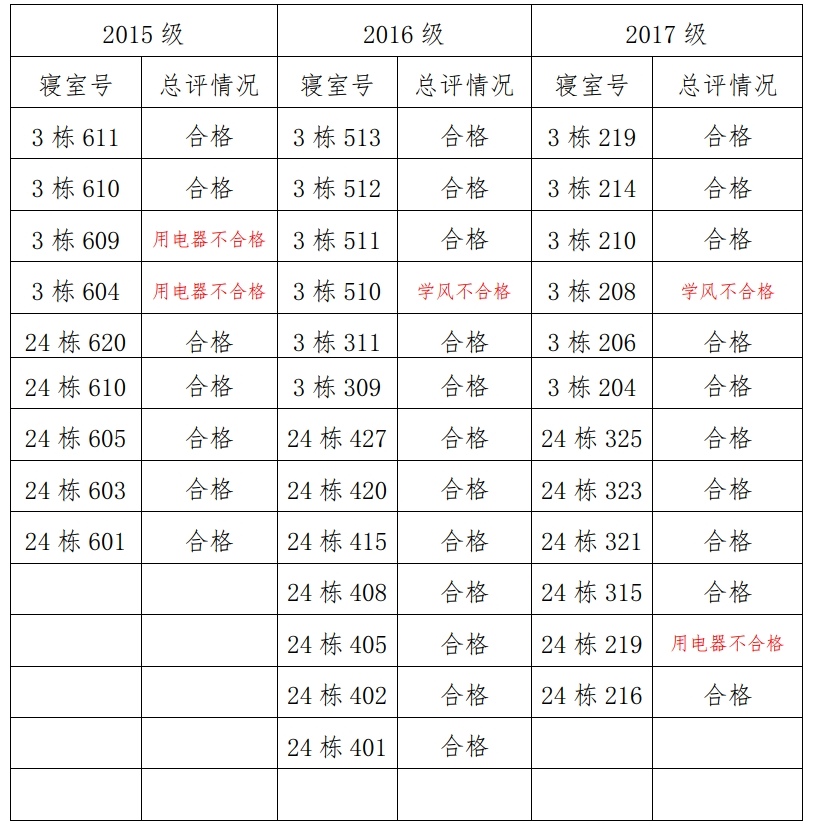 为改正各种不良现象和陋习,增强宿舍学习氛围,营造温馨家园氛围,化学化工学院团委学生会生活部对各年级部分寝室进行检查。本次查寝共检查寝室数 34 间,5 间寝室不合格。所查寝室总评情况如下: