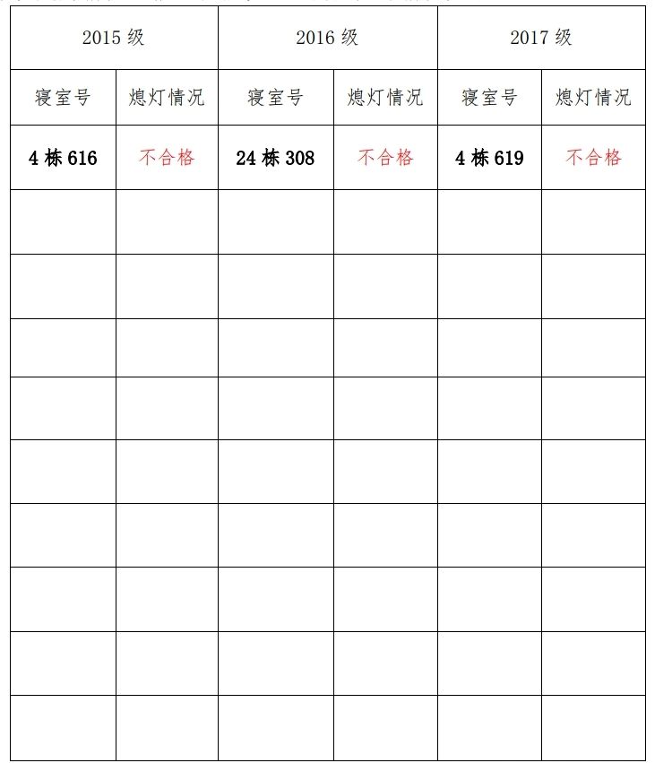 为改正各种不良现象和陋习,增强宿舍学习氛围,营造温馨家园 氛围,化学化工学院学生会生活部对三个年级所有寝室进行熄灯检查。本次熄灯情况通报不合格寝室 3 间,具体情况如下: