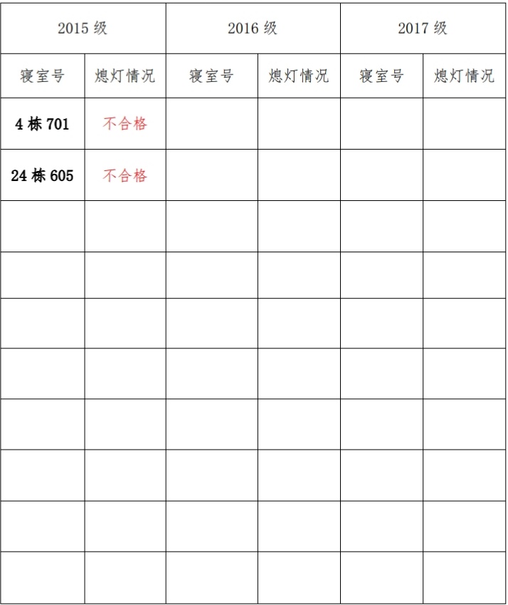 为改正各种不良现象和陋习,增强宿舍学习氛围,营造温馨家园 氛围,化学化工学院学生会生活部对三个年级所有寝室进行熄灯检查。本次熄灯情况通报不合格寝室 2 间,具体情况如下: