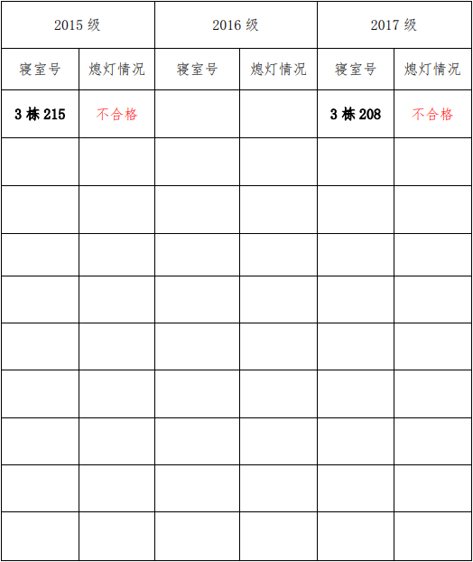 为改正各种不良现象和陋习,增强宿舍学习氛围,营造温馨家园氛围,化学化工学院团委学生会生活权益服务部对三个年级所有寝室进行熄灯检查。本次熄灯情况通报不合格寝室2间,具体情况如下: