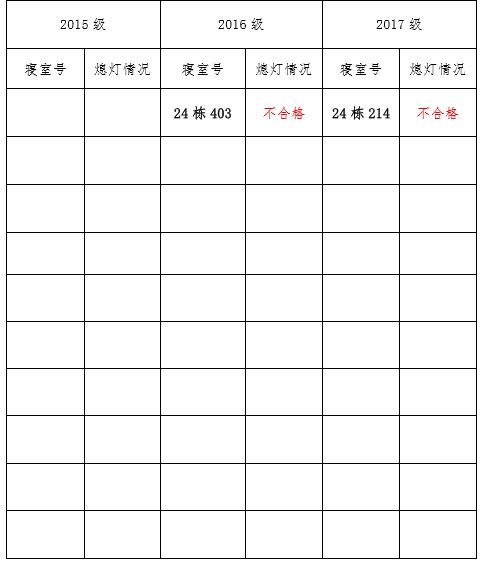 为改正各种不良现象和陋习,增强宿舍学习氛围,营造温馨家园氛围,化学化工学院学生会生活部对三个年级所有寝室进行熄灯检查。 本次熄灯情况通报不合格寝室 2 间,具体情况如下: