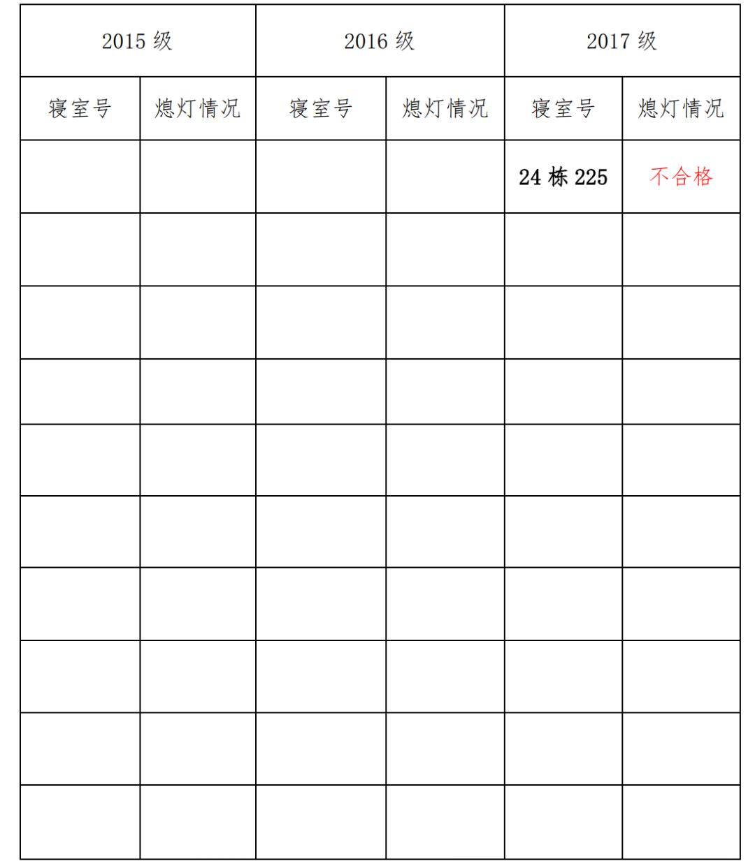 为改正各种不良现象和陋习,增强宿舍学习氛围,营造温馨家园氛围,化学化工学院团委学生会生活权益服务部对三个年级所有寝室进行熄灯检查。本次熄灯情况通报不合格寝室1间,具体情况如下: