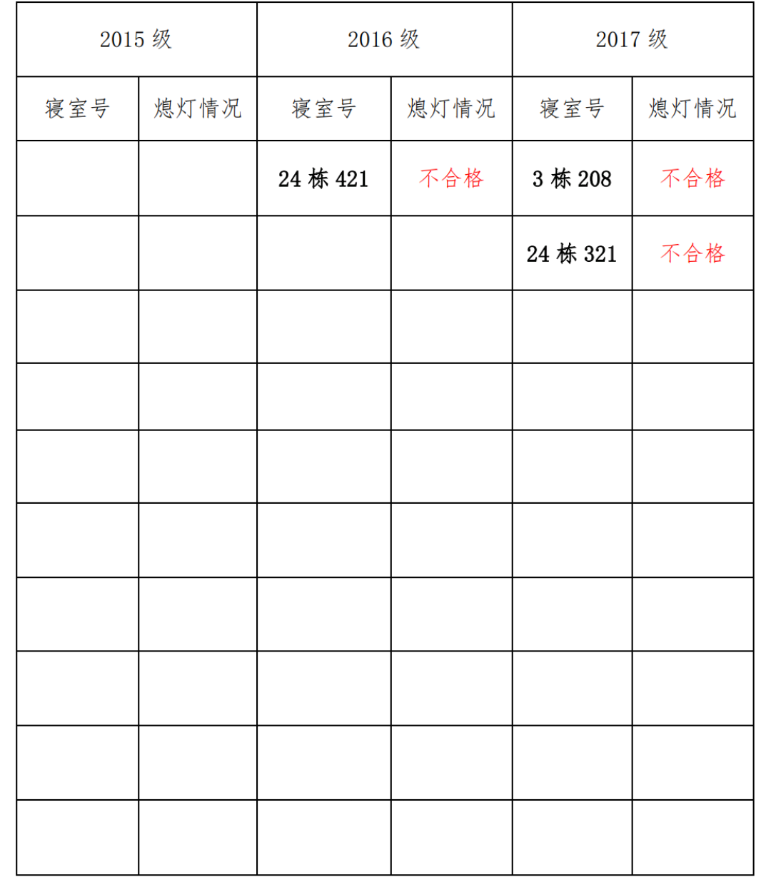 为改正各种不良现象和陋习,增强宿舍学习氛围,营造温馨家园氛围,化学化工学院团委学生会生活权益服务部对三个年级所有寝室进行熄灯检查。本次熄灯情况通报不合格寝室3间,具体情况如下: