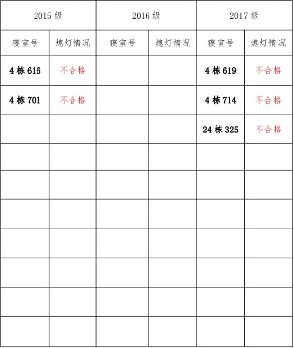 为改正各种不良现象和陋习,增强宿舍学习氛围,营造温馨家园氛围,化学化工学院团委学生会生活权益服务部对三个年级所有寝室进行熄灯检查。本次熄灯情况通报不合格寝室5间,具体情况如下: