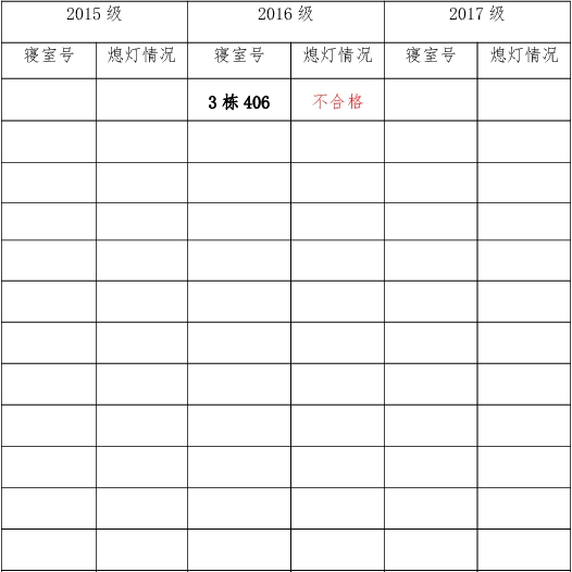 为改正各种不良现象和陋习,增强宿舍学习氛围,营造温馨家园氛围,化学化工学院团委学生会生活权益服务部对三个年级所有寝室进行熄灯检查。本次熄灯情况通报不合格寝室1间,具体情况如下: