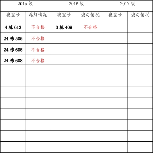 为改正各种不良现象和陋习,增强宿舍学习氛围,营造温馨家园氛围,化学化工学院团委学生会生活权益服务部对三个年级所有寝室进行熄灯检查。本次熄灯情况通报不合格寝室5间,具体情况如下: