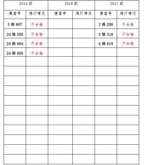 为改正各种不良现象和陋习,增强宿舍学习氛围,营造温馨家园氛围,化学化工学院团委学生会生活权益服务部对三个年级所有寝室进行熄灯检查。本次熄灯情况通报不合格寝室 7 间,具体情况如下:
