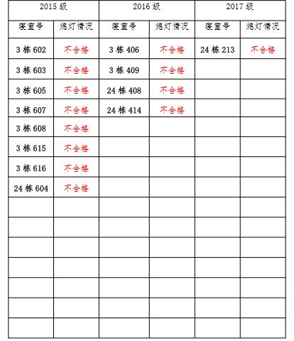 为改正各种不良现象和陋习,增强宿舍学习氛围,营造温馨家园 氛围,化学化工学院团委学生会生活权益服务部对三个年级所有寝室进行熄灯检查。本次熄灯情况通报不合格寝室 13 间,具体情况如下: