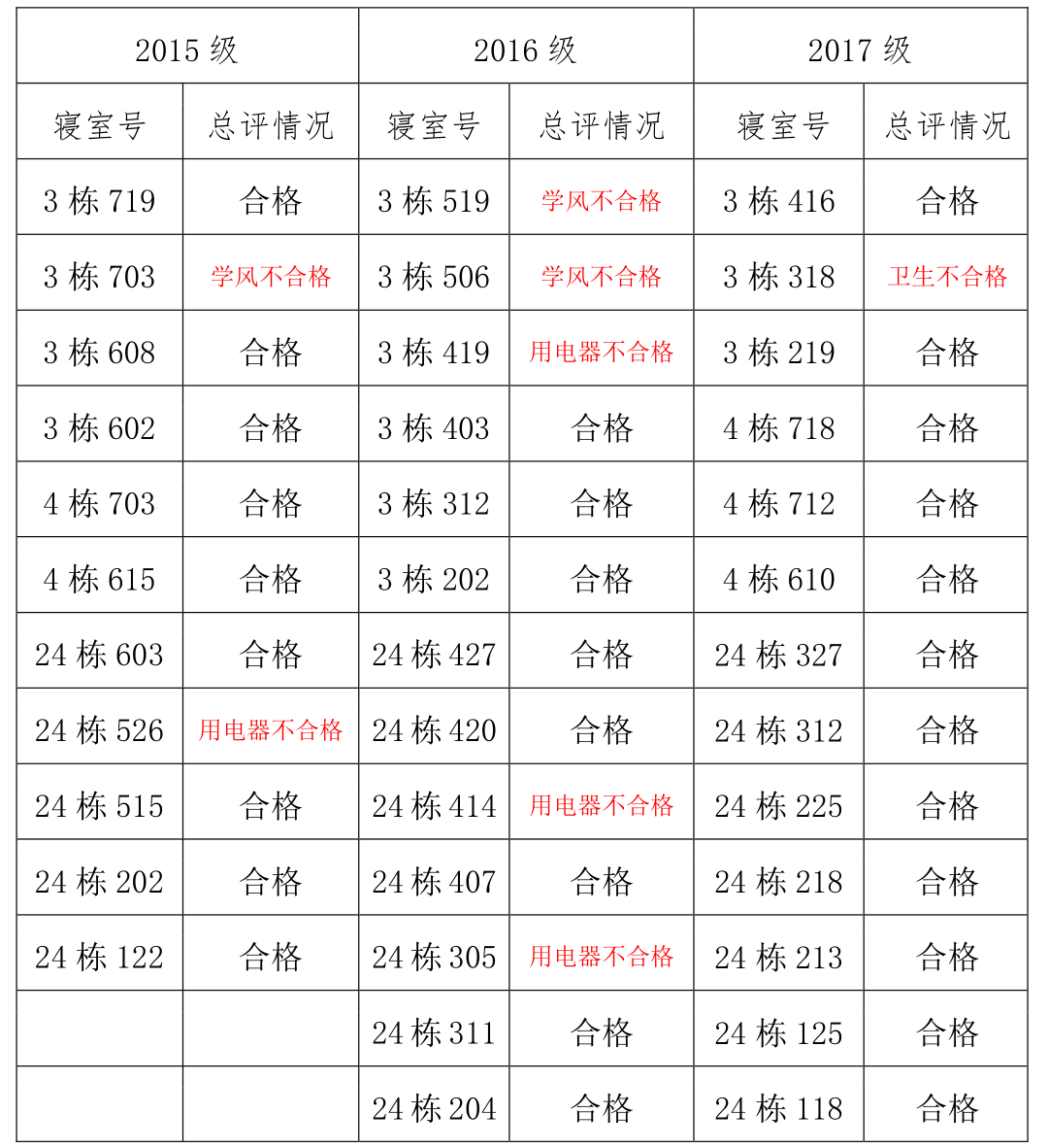 为改正各种不良现象和陋习,增强宿舍学习氛围,营造温馨家 园氛围,化学化工学院团委学生会生活权益服务部对各年级部分寝 室进行检查。本次查寝共检查寝室数 37 间,8 间寝室不合格。所查 寝室总评情况如下: