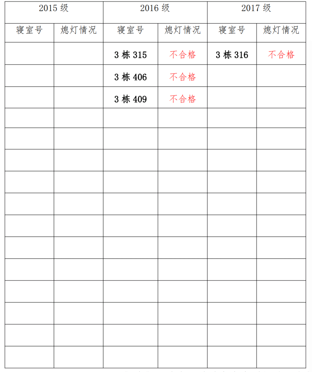 为改正各种不良现象和陋习,增强宿舍学习氛围,营造温馨家园氛围,化学化工学院团委学生会生活权益服务部对三个年级所有寝室进行熄灯检查。本次熄灯情况通报不合格寝室4间,具体情况如下: