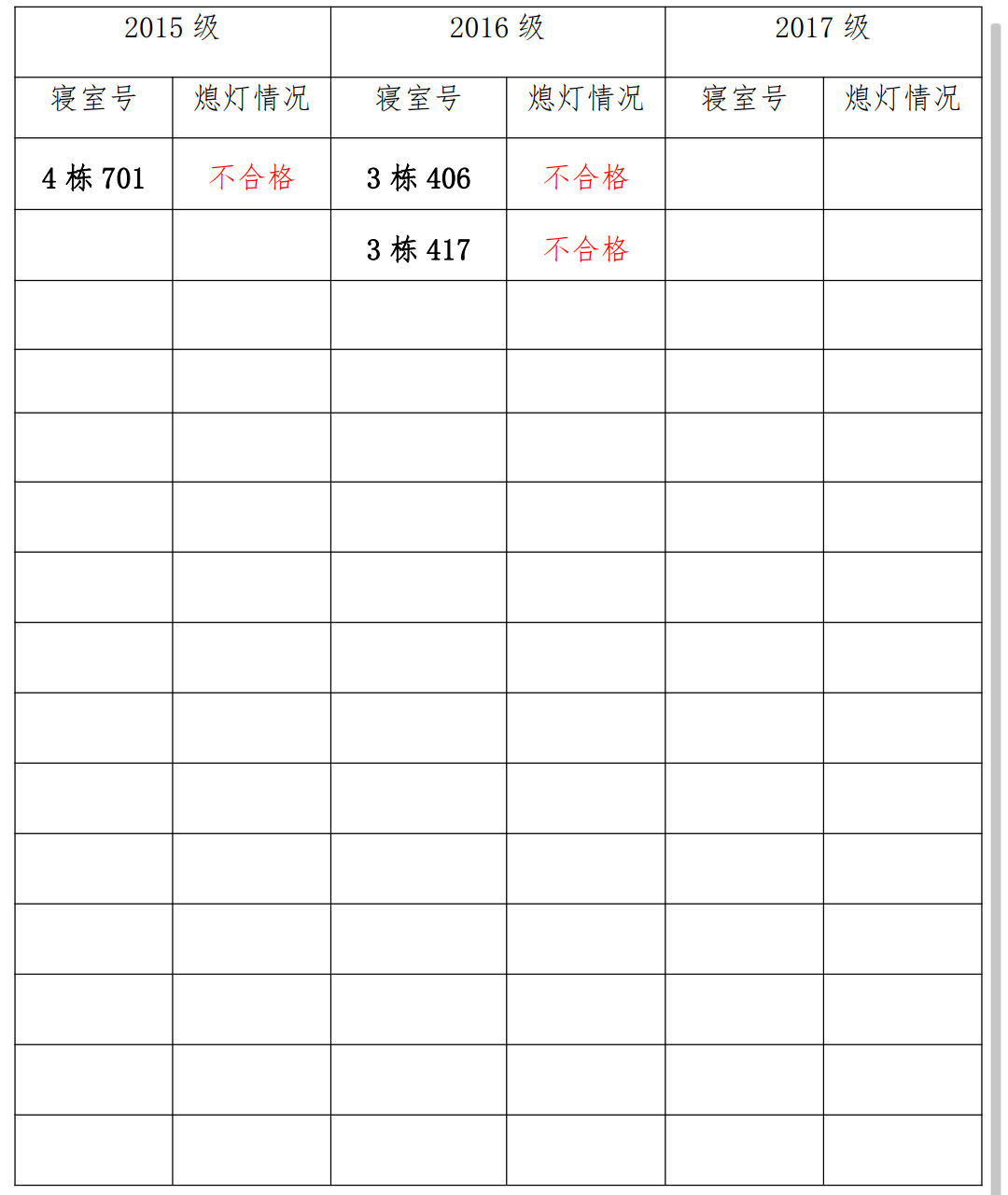 为改正各种不良现象和陋习,增强宿舍学习氛围,营造温馨家园氛围,化学化工学院团委学生会生活权益服务部对三个年级所有寝室进行熄灯检查。本次熄灯情况通报不合格寝室3间,具体情况如下: