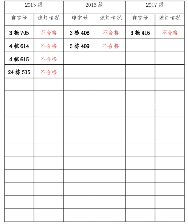 为改正各种不良现象和陋习,增强宿舍学习氛围,营造温馨家园氛围,化学化工学院团委学生会生活权益服务部对三个年级所有寝室进行熄灯检查。本次熄灯情况通报不合格寝室7间,具体情况如下:
