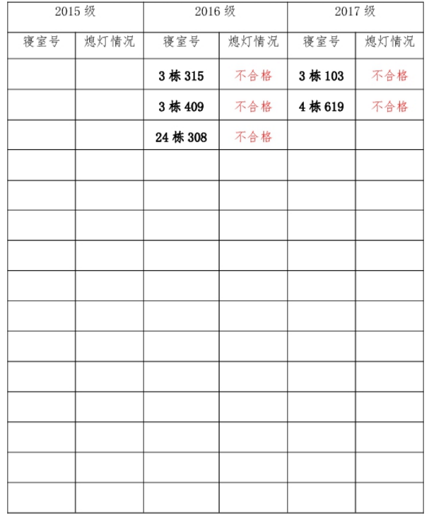 为改正各种不良现象和陋习,增强宿舍学习氛围,营造温馨家园氛围,化学化工学院团委学生会生活权益服务部对三个年级所有寝室进行熄灯检查。本次熄灯情况通报不合格寝室 5 间,具体情况如下: