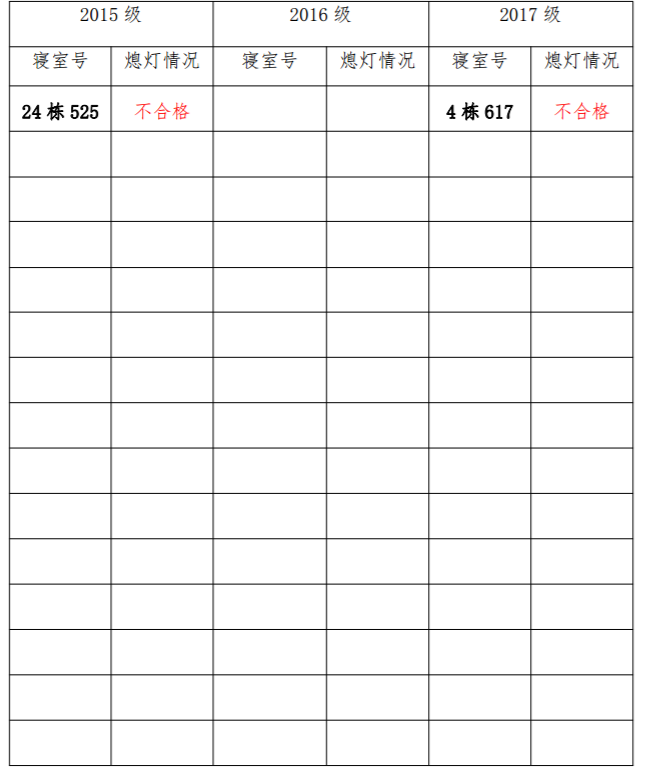 为改正各种不良现象和陋习,增强宿舍学习氛围,营造温馨家园氛围,化学化工学院团委学生会生活权益服务部对三个年级所有寝室进行熄灯检查。本次熄灯情况通报不合格寝室 2 间,具体情况如下: