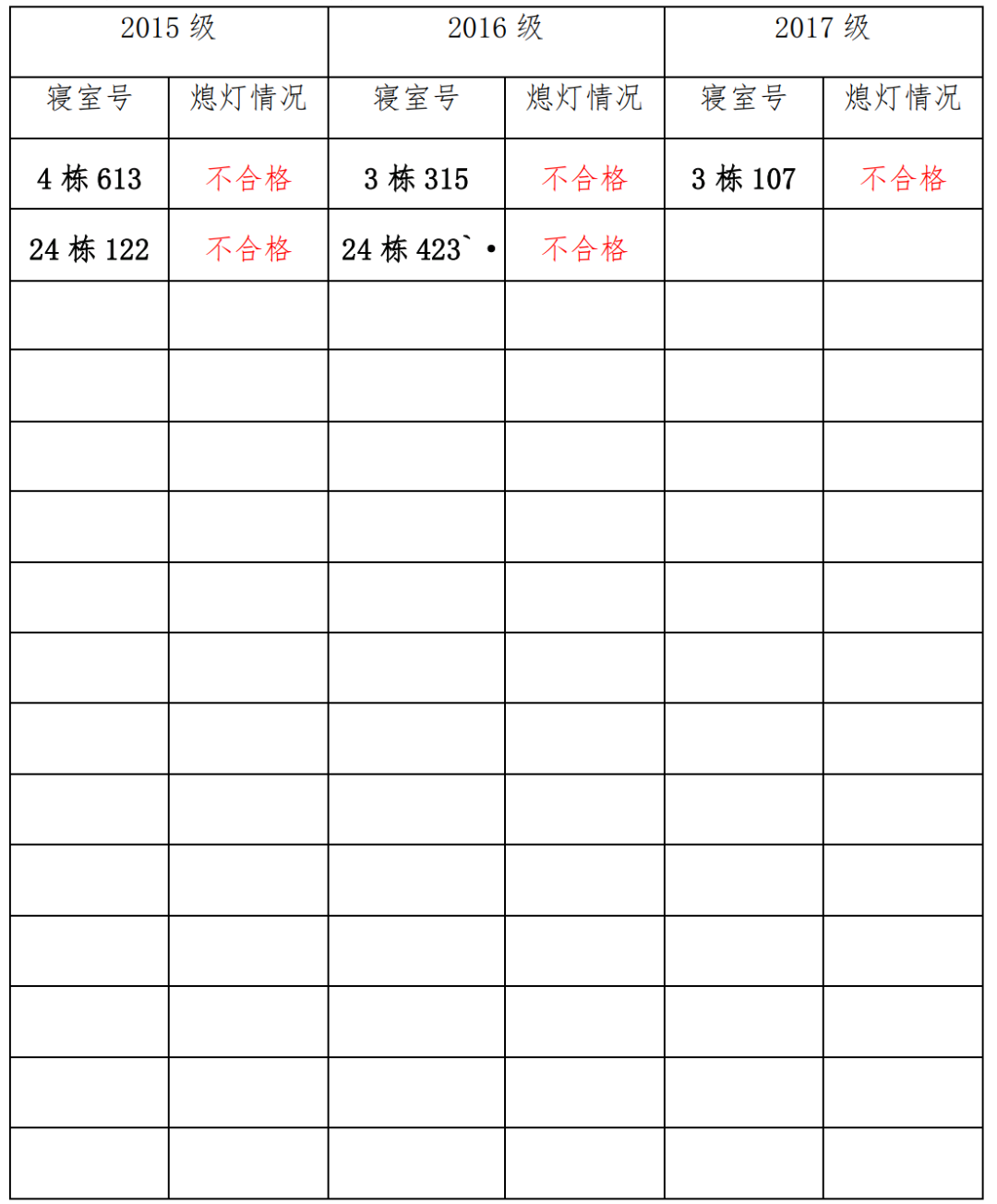 为改正各种不良现象和陋习,增强宿舍学习氛围,营造温馨家园氛围,化学化工学院团委学生会生活权益服务部对三个年级所有寝室进行熄灯检查。本次熄灯情况通报不合格寝室 5间,具体情况如下: