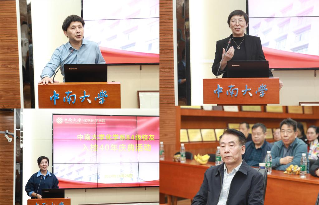 2024年10月26日下午,中南大学化学系84级校友入校40年庆典活动在新校区化学楼129会议室举行,化学系84级辅导员韩清波、化学化工学院党委书记刘有才、院长卢红梅以及60余名化学系84级校友出席活动,此次活动由化学化工学院党委副书记滕晓雯主持。