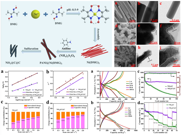 由于过渡金属硫化物来源丰富,成本低廉且理论比容量高,是一种很有前景的钠离子电池负极材料。然而,由于其存在导电性差、充放电过程中体积膨胀严重等缺点,使其在钠离子电池中的应用受到了严重影响。因此寻找一种合适的方法以增强过渡金属硫化物的导电性并抑制其在充放电过程中的体积膨胀,对于其作为钠离子电池负极材料具有深远影响。基于此,纪效波团队选择以镍螯合物—丁二酮肟镍为前驱体,通过巧妙的设计,得到双碳层修饰的NiS2电极材料。不同于直接的碳包覆,该方法选择将前驱体进行包覆处理后再进行NiS2的转化,不仅使得前驱体的结构得到了较好的维持,而且在转化过程中包覆碳层的功能也得到了相应的强化。使得得到的电极材料在导电性和循环性能增强的情况下,初始容量并没有因为碳层的包覆而过多的下降。电化学测试表明,该功能化碳修饰的NiS2材料(NiS2@C@C),其首圈充电容量为669.2 mAh g-1,略低于未进行改性的NiS2@C(732.5 mAh g-1);在100 mA g-1的电流密度下循环100圈后,仍有580.8 mAh g-1的容量,远高于NiS2@C电极的86.8 mAh g-1。此外,相比于NiS2@C电极,NiS2@C@C电极的倍率性能也得到了极大地改善。该工作使得NiS2在钠离子电池负极材料方面的应用成为可能,同时,也为同类过渡金属硫化物材料的改性设计和制备提供了新思路,有助于其在钠离子电池负极材料的实际应用。