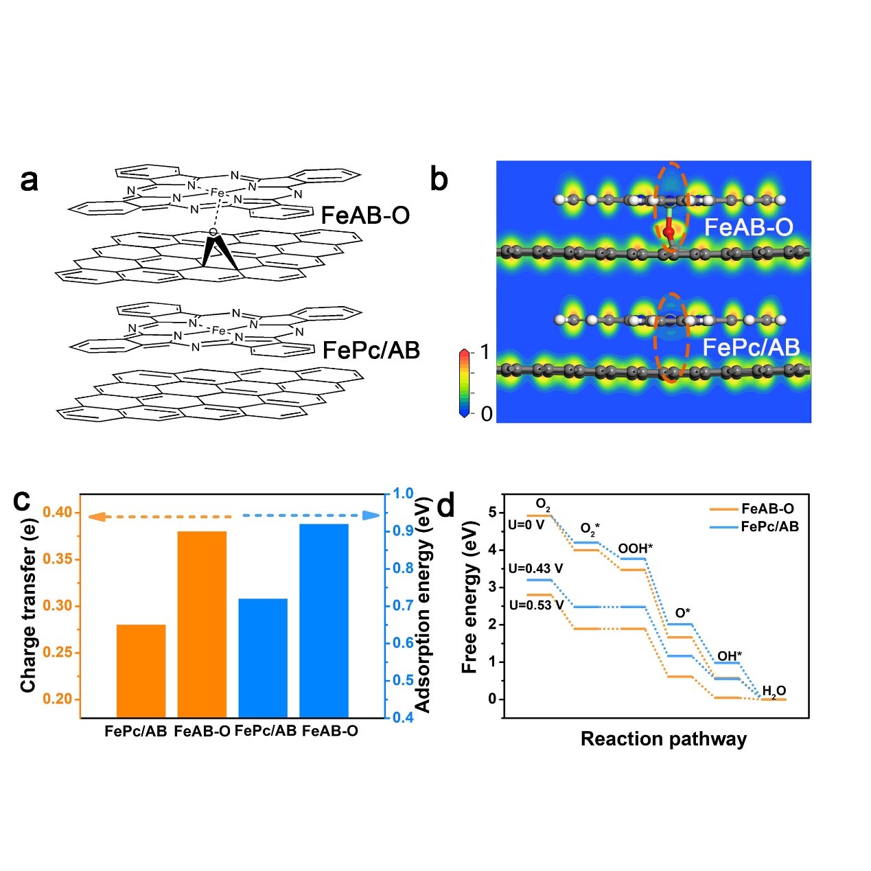 开发低成本高活性的氧还原催化剂对燃料和金属空气电池的快速发展至关重要。铁酞菁分子催化剂具有独特的Fe-N4活性和较低的氧还原反应能垒,从而引起了广泛的关注和研究。然而,铁酞菁的二维平面结构导致了其对称的电子结构,并且这种电子结构限制了其对氧气的吸附和活化,调控活性中心的电子结构提高反应活性具有重要意义。刘敏教授团队提出了一种轴向Fe-O配位诱导的电子重分布策略,通过配位诱导电荷局域化,打破活性中心的电荷对称性,提高了分子催化剂的氧还原活性。理论计算表明,配位可有效调节铁酞菁的电子结构,使得其催化性能增强。同步X射线和莫斯堡尔谱的测试结果表明了配位的有效构建并提高了氧气的吸附能力。实验所获得的最优催化剂,显示出极其优异的氧还原性能,半波电位为0.90 V,塔菲儿斜率为创纪录的27.5 mV dec?1。这项工作为构建高效的分子催化剂打开了新思路。