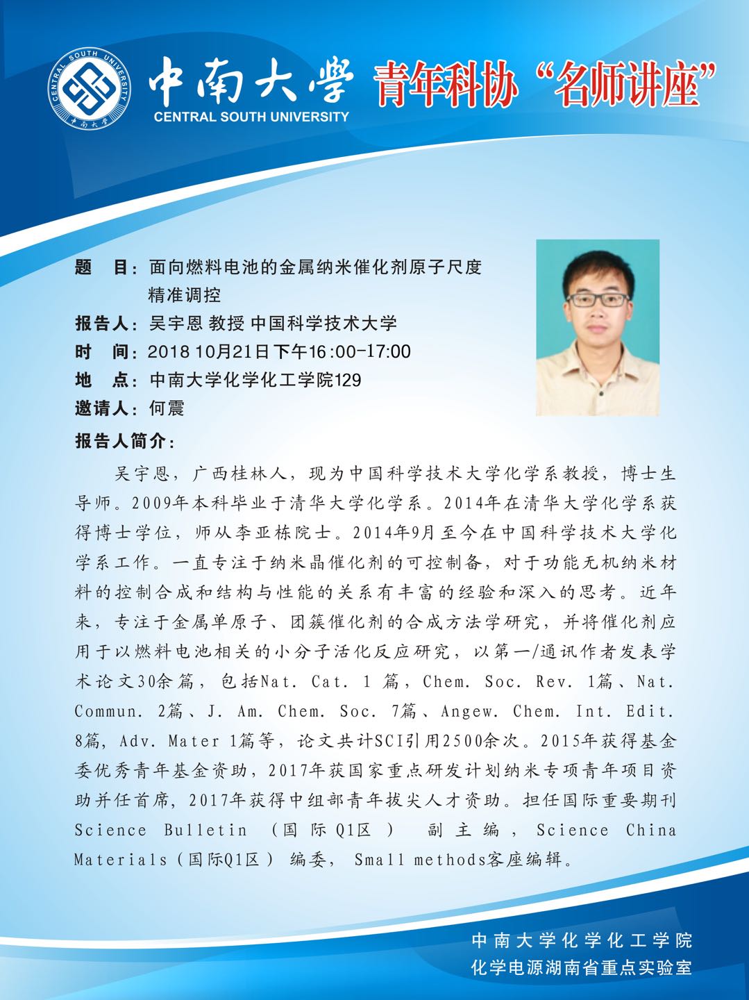 2018年10月21日 吴宇恩教授 《面向燃料电池的金属纳米催化剂原子尺度精准调控》报告