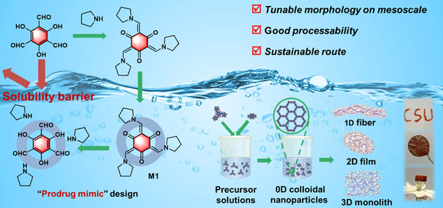 为此,受口服低水溶性药物“前药设计”方法启发,该团队引入极性基团来改善醛类化合物水溶性,通过溶胶-凝胶策略,实现水相合成条件下COF胶粒及COF凝胶的可控制备。结合TR-DLS、SEM等表征手段,研究COF材料的溶胶-凝胶过程并展开深入的机理分析。溶胶-凝胶工艺流程的优化,进一步调控了COF胶体粒子间的交联聚合程度,实现了宏观尺寸COF材料绿色可持续加工(图1)。成功制备出1D纤维、2D膜和3D水凝胶或气凝胶,为该类材料的绿色可持续制备提供了新思路和新方案。