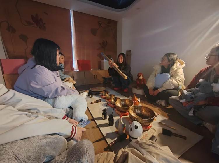 在心助会的全程陪同与引导下,同学们依次体验了五大心理主题区域:“互联启心吧”让同学们发现自己的闪光点;“冥思悟心吧”引导大家在静默中觉察自我;“疗愈炼心吧”通过颂钵和“脑力赛车”舒缓情绪;“潜能探心吧”激发创意与内在能量;“VR映心吧”则借助科技带来沉浸式心理体验。各区域有工作人员提供指导,心助会成员也从旁协助,营造出轻松而投入的体验氛围。