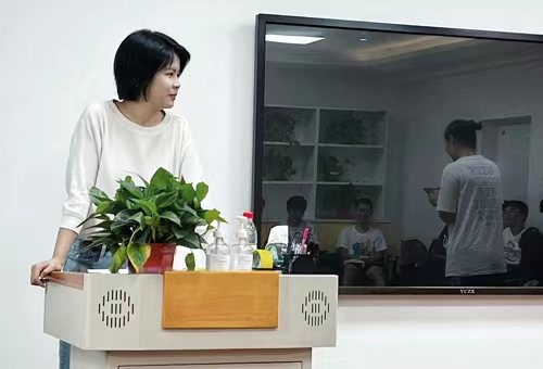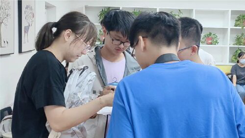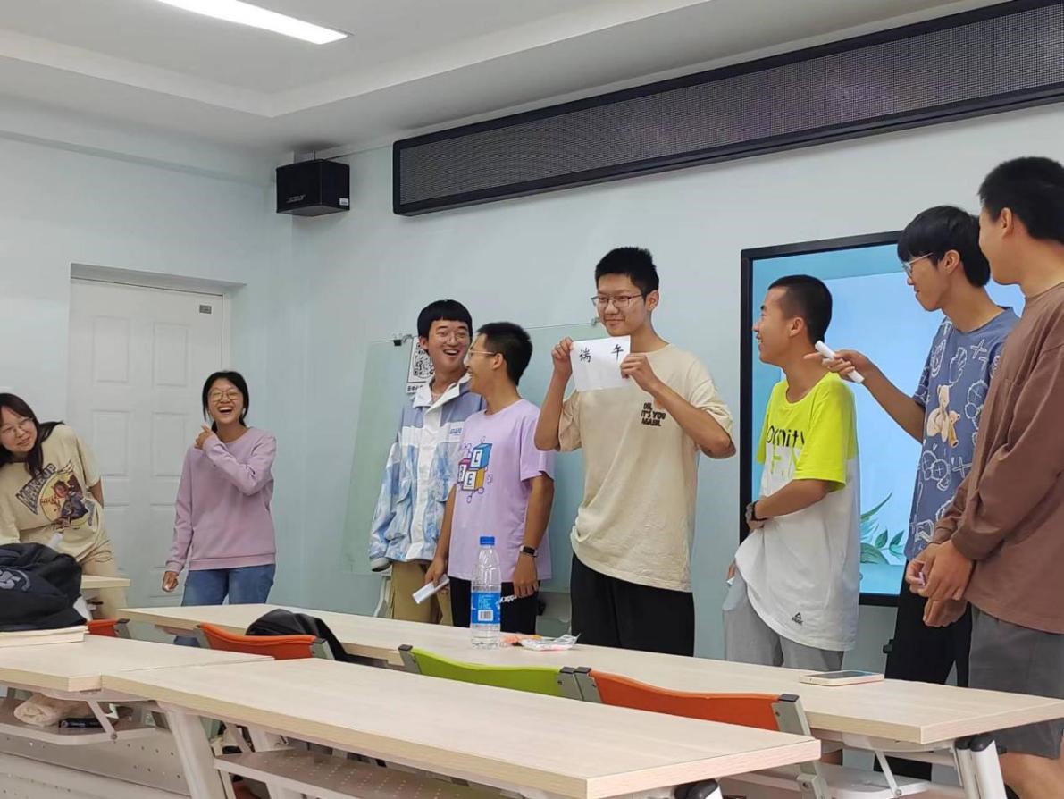 接着是有趣的游戏环节:“谁是卧底”,同学们需要根据每个人的描述推理出与其余同学关键词不同的“卧底”是谁;“你画我猜”,一名同学用肢体动作表现词语,其余同学依此进行猜测;“背靠背”,同学们相互背对背蹲下后同时站起方为成功;“寻找一个TA”,同学们对照一张写有许多个人特点的表格找到符合表格上特点的同学签名。