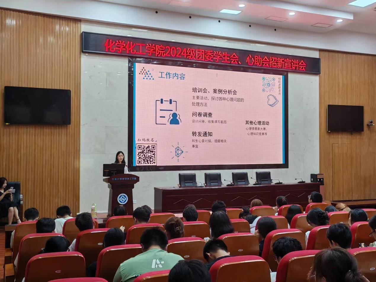 本次招新宣讲会不仅展现了化学化工学院朋辈心理互助会的风采,也为各位2024级新生提供了一个了解和加入心助会的机会,帮助其更快适应大学生活。相信随着新鲜血液的注入,新一学年的心助会工作将会高效有序开展,心助会将继续在心理健康工作中取得更加优异的成绩。