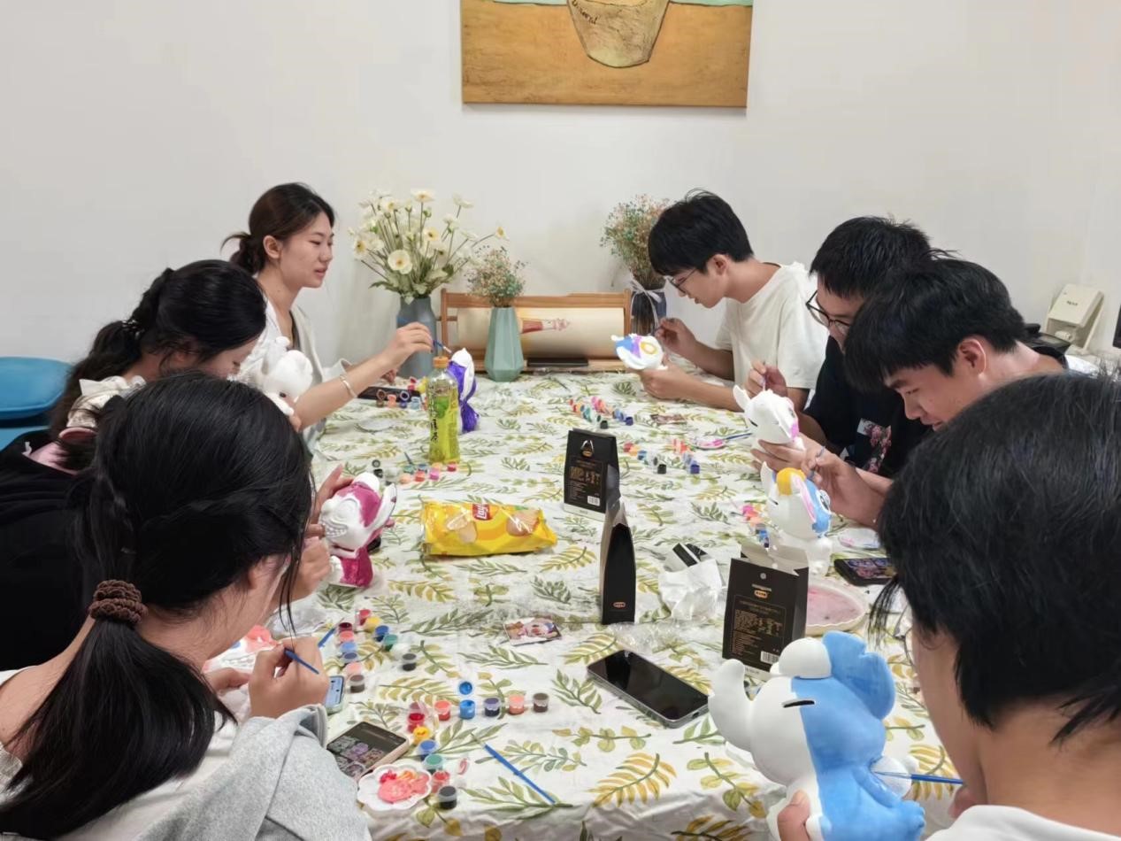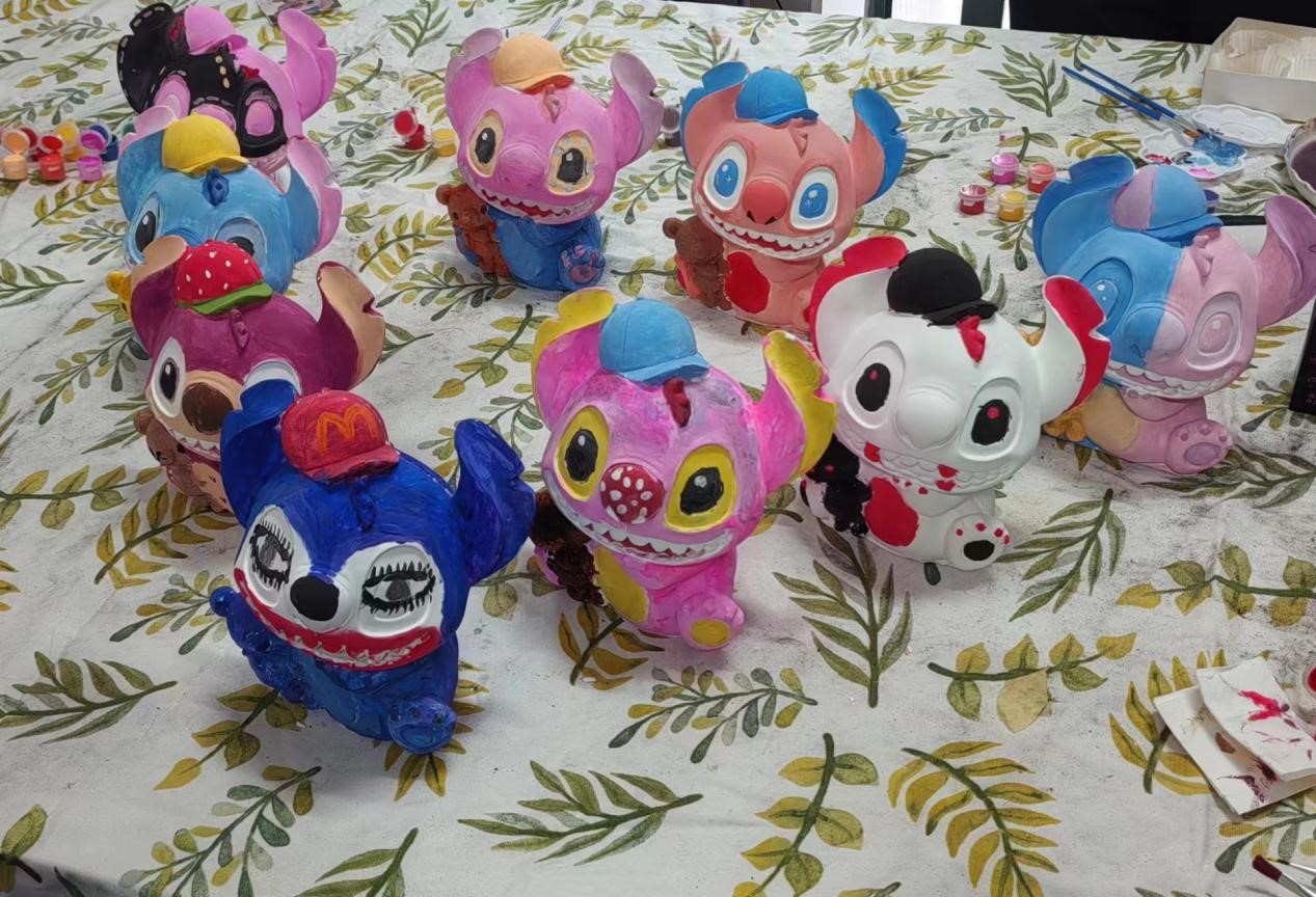 五彩斑斓的颜料在石膏娃娃上肆意流淌,石膏娃娃成为了承载梦想与创意的载体。在互相讨论和分享过程中,同学们逐渐放松了紧绷的神经,整个活动室充满了和谐与温馨的氛围。大约两个小时后,同学们的作品接连呈现,五彩斑斓、各具特色,每一个石膏娃娃都融入了同学们的独特创意与情感。