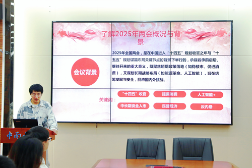 本次2025年两会精神专题学习中,主要分为“了解2025年两会概况与背景”和“学习习近平总书记重要讲话精神”两个部分。第一部分中,王曾杰介绍了两会的全称、召开的时间地点及会议背景,并对“‘十四五’收官”、“提振消费”、“人工智能+”、“中长期资金入市”等六个关键词做了详细讲解。