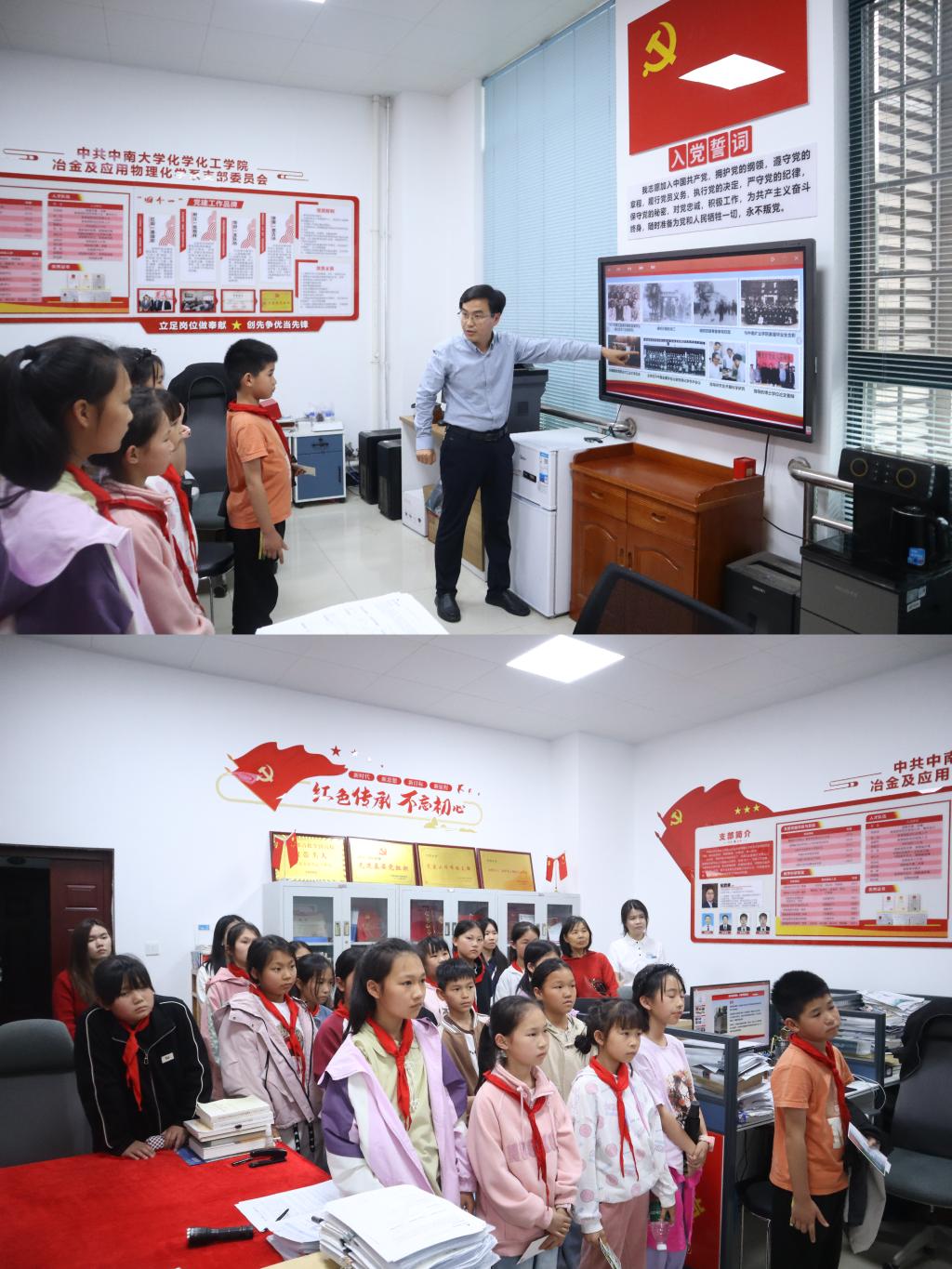 在冶金物化系党支部侯红帅老师的带领下,小朋友们走进“有色之师”陈新民院士生平展览,通过珍贵史料了解学院历史,感受到化学家们矢志报国的科学家精神。