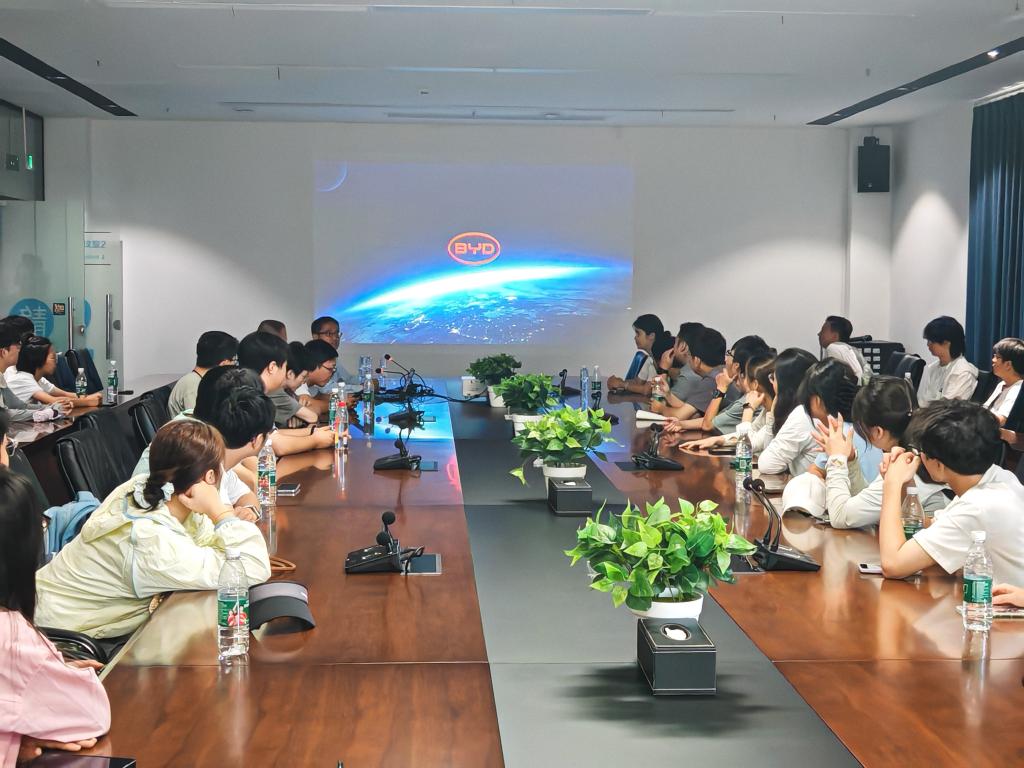 在弗迪公司人资部颜总的介绍下,师生们了解了长沙比亚迪弗迪电池-动力电池工厂的整体布局、工厂简介,并且参观了实验室车间、文化长廊、装配车间等,通过与工厂现场工程师及技术人员的充分沟通研讨,深入洞察新能源电池行业尖端技术走向与市场最新动态。陈总强调,比亚迪始终秉持"心无旁骛搞创造,踏踏实实搞创新"的发展理念,这一求真务实、专注创新的企业精神令在场同学深受启发,获益良多。