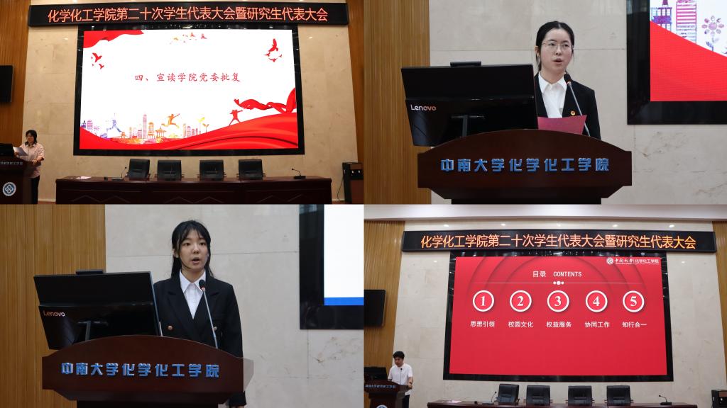 随后,汪菁垚和程一凡依次宣读学院党委批复、校级学生会组织批复。邓迪国际学院学生会主席团成员刘烨代表邓迪国际学院学生会带来了诚挚的祝贺。大会听取并审议了第十九届学生会、研究生会工作报告,通过了关于学生会组织工作报告和章程修正案的决议,选举产生了第二十届学生会、研究生会主席团成员及出席中南大学第九次学生代表大会暨研究生代表大会学生代表。邢梦雨、沙思怡等21名同学当选出席中南大学第九次学生代表大会暨研究生代表大会代表,王宇轩、刘凯越、李琳当选化学化工学院学生会第二十届主席团成员,孟哲宇、何祎阳、吴月薇当选化学化工学院研究生会第二十届主席团成员。